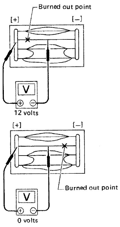 3) If a filament is burned out, circuit tester registers 0 or battery voltage.