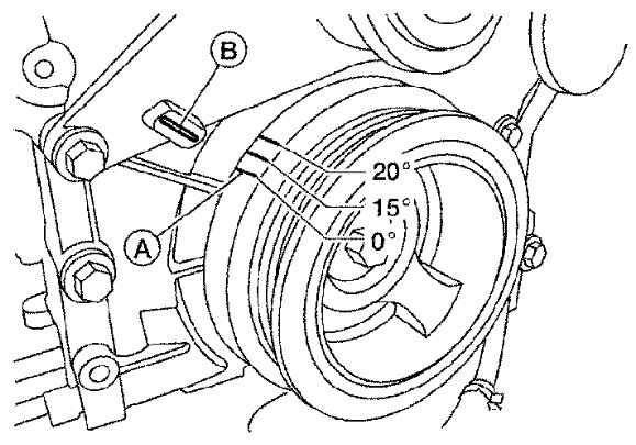 - Rotate crankshaft pulley clockwise to align timing mark (A) (grooved line without color) with timing indicator (B).