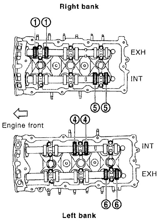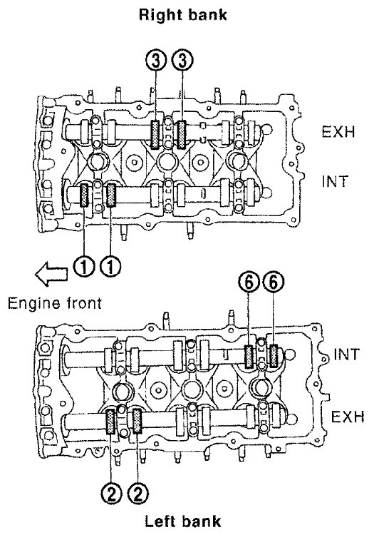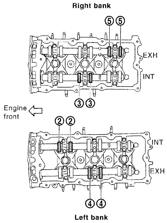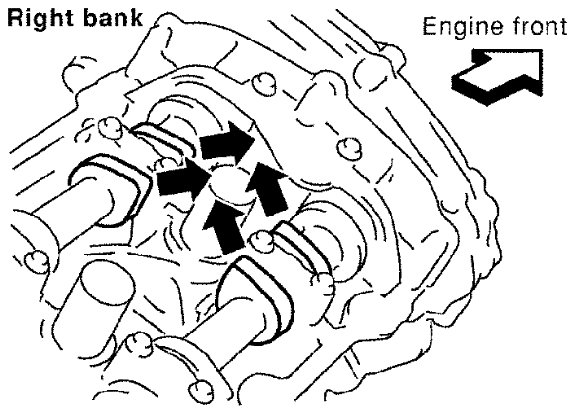 - Make sure that intake and exhaust cam noses on No. 1 cylinder (engine front side of RH bank) are located as shown.