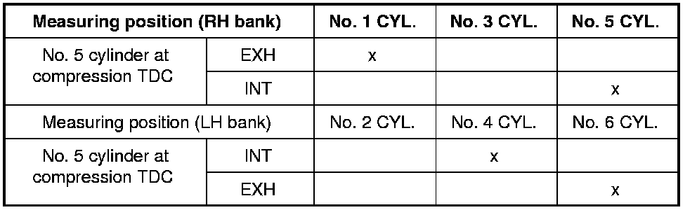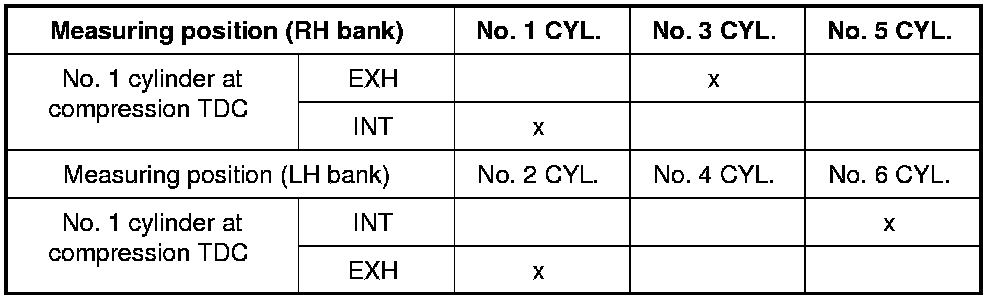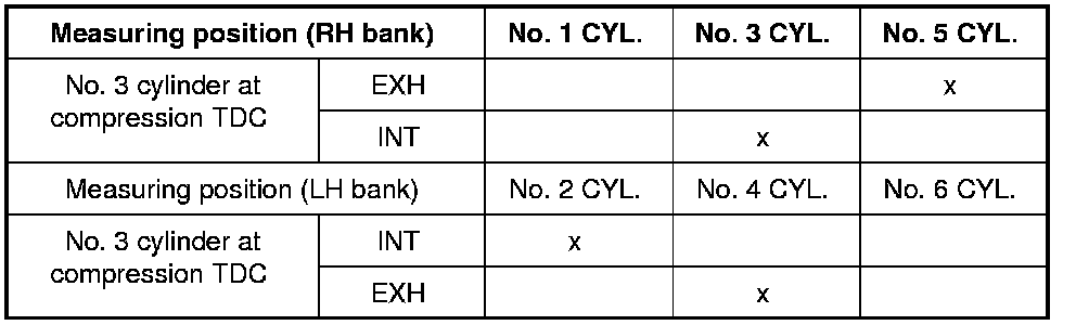 - Measure the valve clearances at locations marked "x" as shown in the table below (locations indicated in the illustration) with feeler gauge.