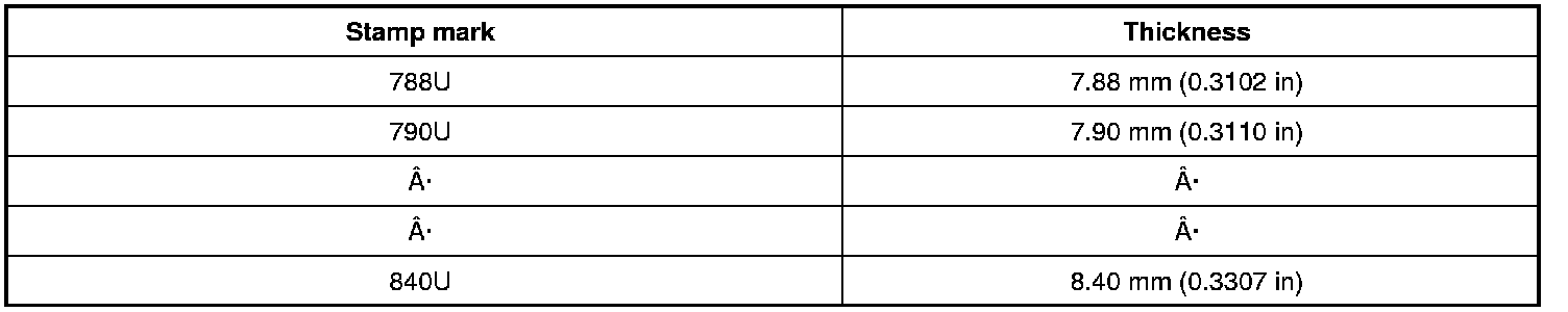 Available thickness of valve lifter: 27 sizes with range 7.88 to 8.40 mm (0.3102 to 0.3307 in) in steps of 0.02 mm (0.0008 in) (when manufactured at factory). Refer to [Service Data and Specifications] [1][2]Specifications.