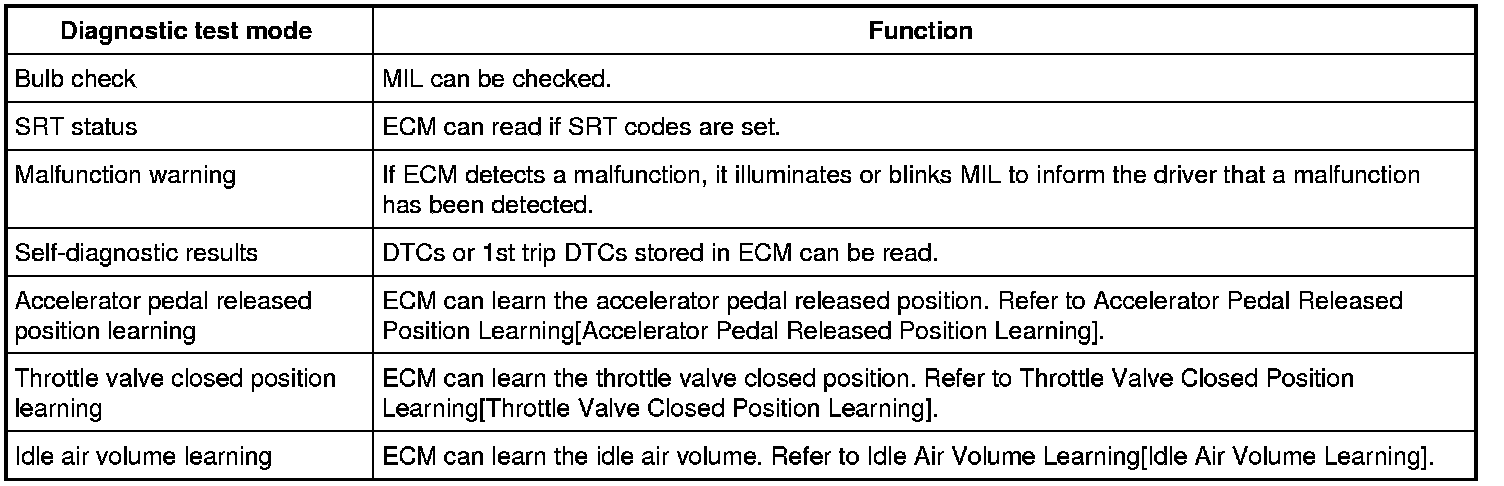 This function allows to read if ECM has completed the self-diagnoses of major emission control systems and components. For SRT, refer to [System Readiness Test (SRT) Code] System Readiness Test (SRT) Code.