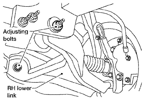 2) If outside of the specified value, adjust camber and caster using the adjusting bolts in the front lower link.