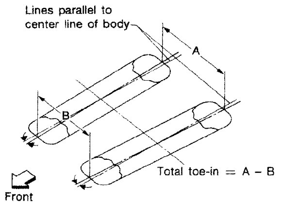 6) Measure the distance (B) on the front side of the front tires at the same marks as shown. Total toe-in is calculated as (A - B).