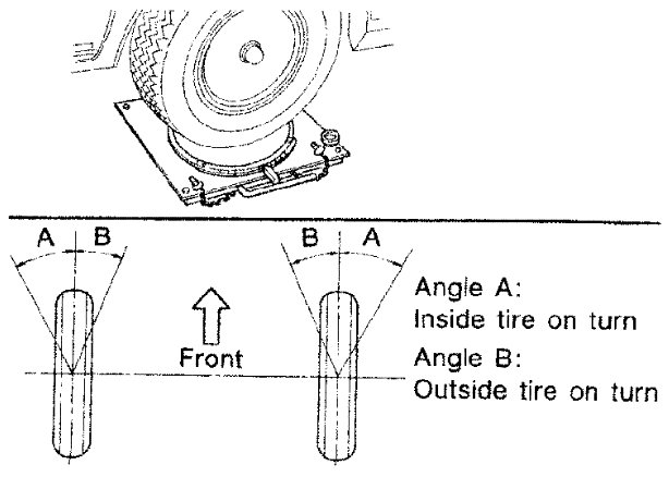 1) Place front wheels on turning radius gauges in straight ahead position and rear wheels on stands so that vehicle can be level. Check the maximum inner and outer wheel turning angles for LH and RH road wheels.