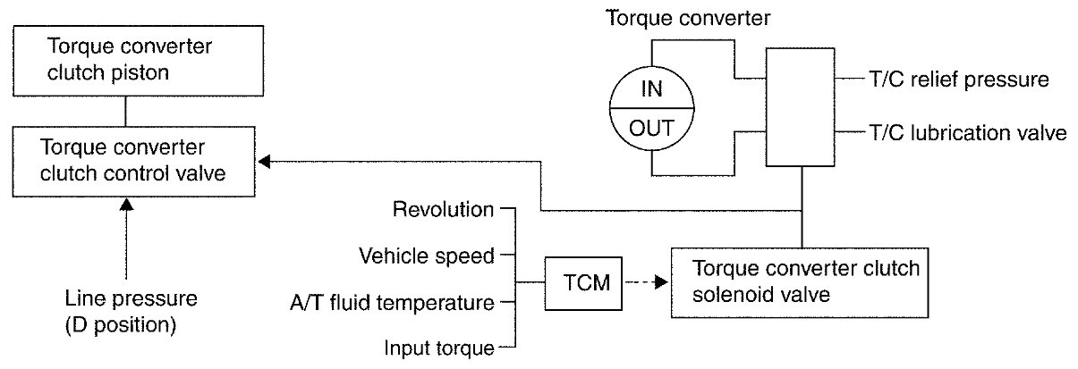 The torque converter clutch control valve operation is controlled by the torque converter clutch solenoid valve, which is controlled by a signal from TCM, and the torque converter clutch control valve engages or releases the torque converter clutch piston.