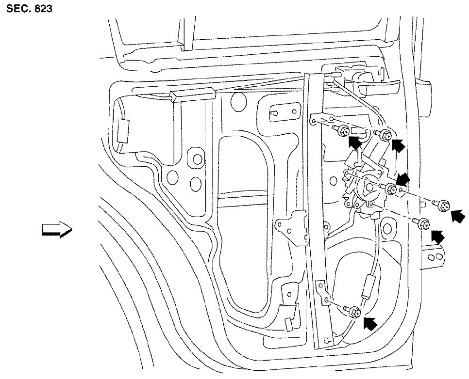 a) Loosely install the top rear regulator bolt to use along with the temporary holds on the window motor or manual crank assembly to install the assembly in the door.