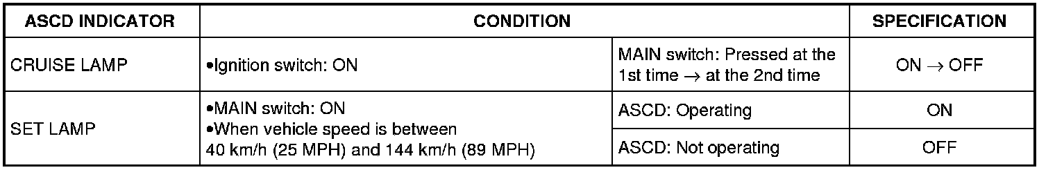 CRUISE indicator illuminates when MAIN switch on ASCD steering switch is turned ON to indicate that ASCD system is ready for operation.