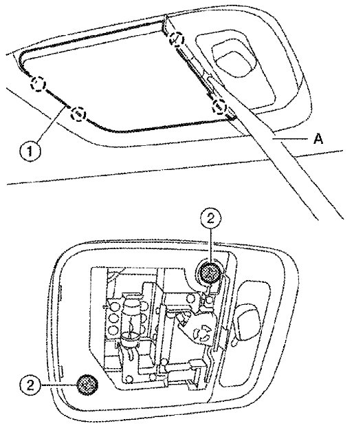 1) Using a suitable tool (A), release the pawls and remove the room lamp lens (1).