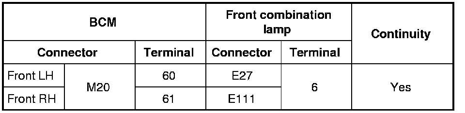 3 Check continuity between the BCM harness connector and the front combination lamps harness connector.