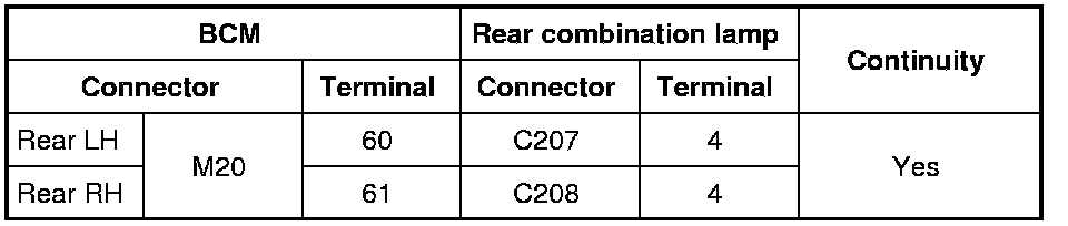 4 Check continuity between the BCM harness connector and the rear combination lamp harness connector.