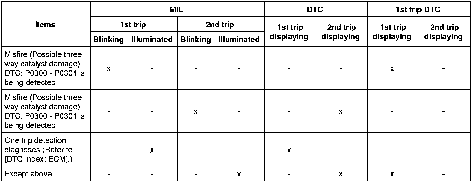 If the same malfunction is detected again during the next drive, the DTC and Freeze Frame data are stored in the ECM memory, and the MIL illuminates. The MIL illuminates at the same time when the DTC is stored. [2nd trip] The "trip" in the "Two Trip Detection Logic" means a driving mode in which self-diagnosis is performed during vehicle operation. Specific on board diagnostic items will cause the ECM to illuminate or blink the MIL, and store DTC and Freeze Frame data, even in the 1st trip, as shown below.