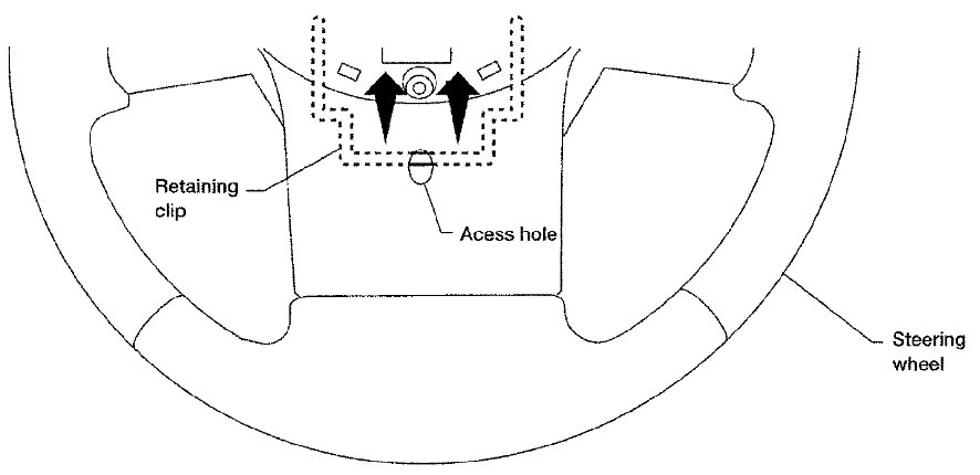 3) Press upward (toward center of steering wheel) on retaining clip until driver air bag module is released from steering wheel.