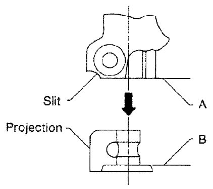 - With the wheels in the straight ahead position, align the slit of the lower joint with the projection on the dust cover. Insert the joint until surface (A) contacts surface (B).