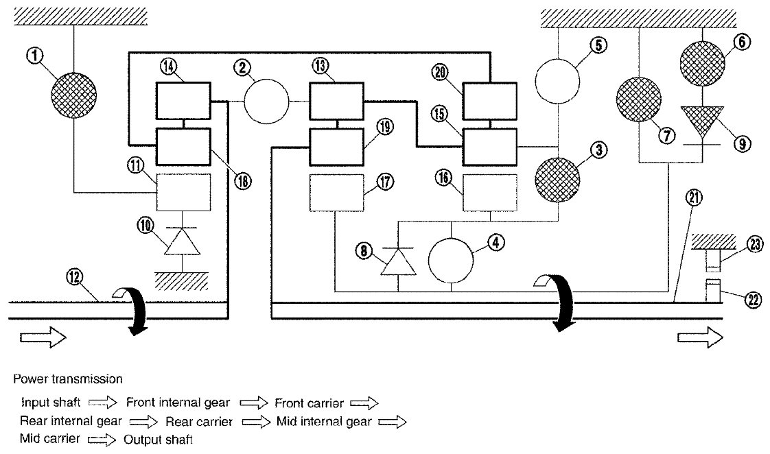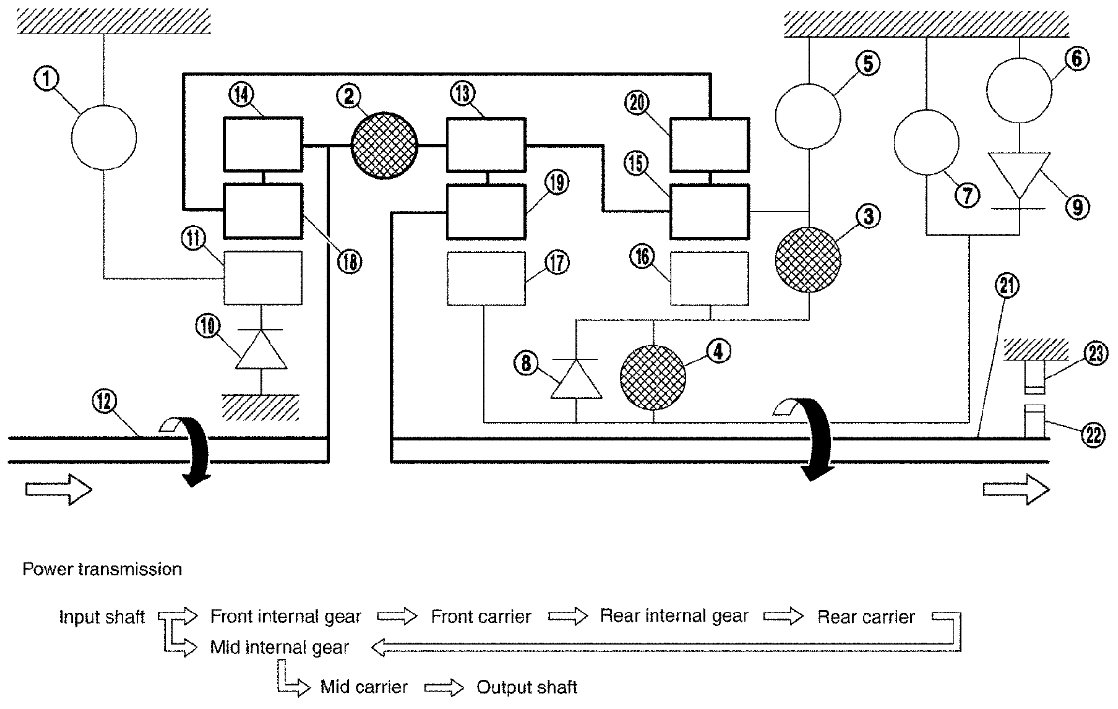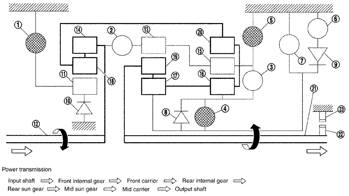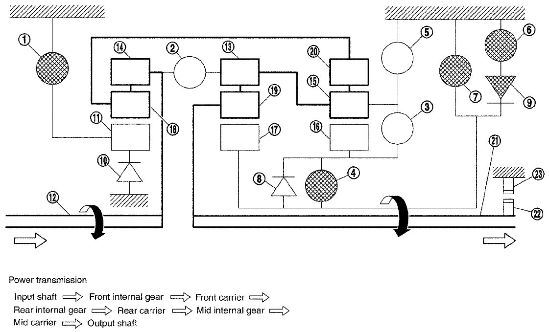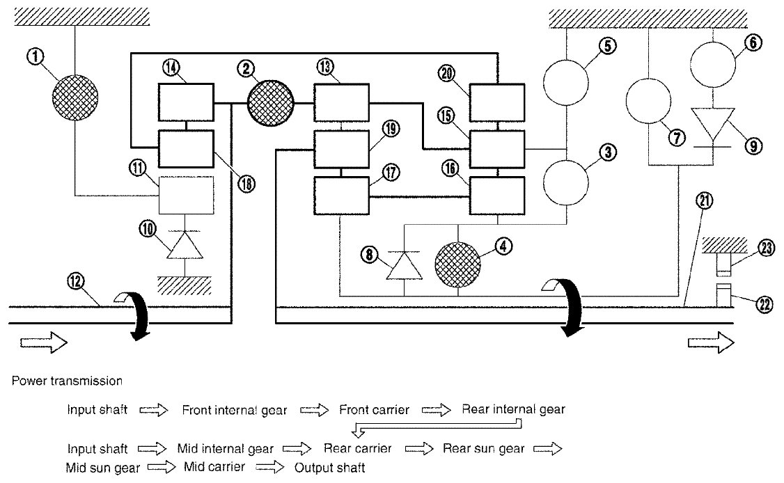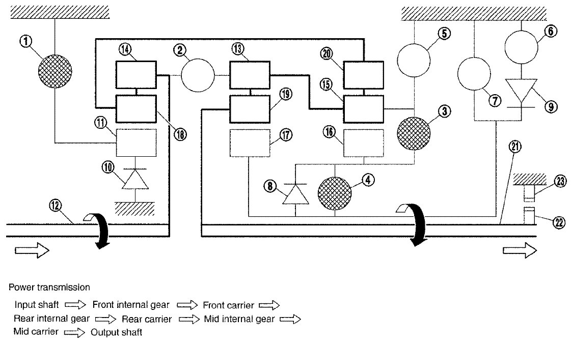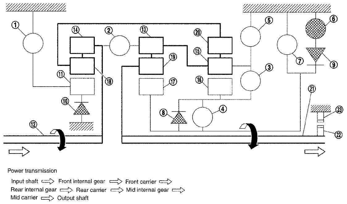 - The drive power is conveyed to the front internal gear, mid internal gear, and rear carrier and the three planetary gears rotate forward as one unit.