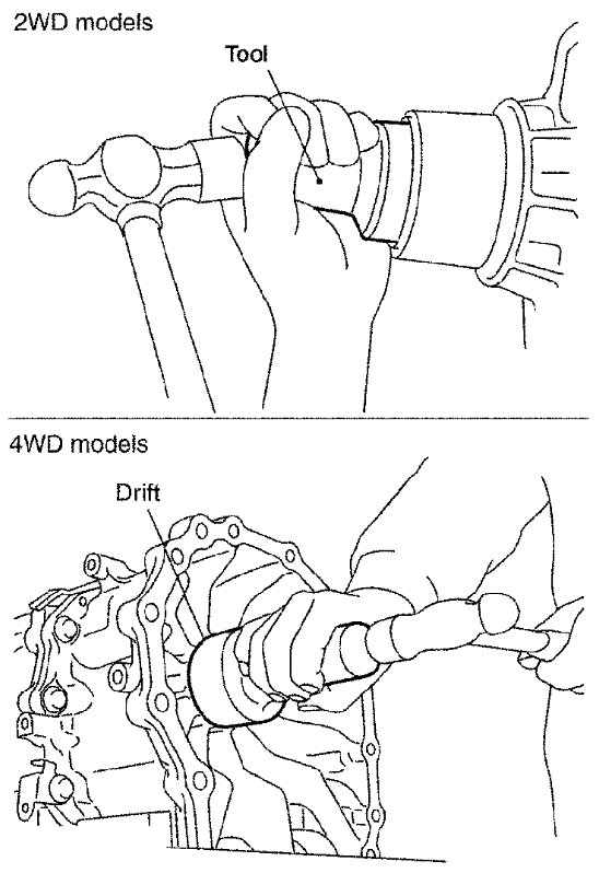 1) Install new rear oil seal until it is flush into the rear extension case (2WD models) using Tool or adapter case (4WD models) using suitable tool.