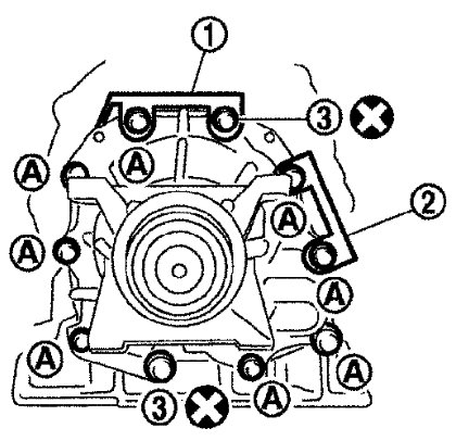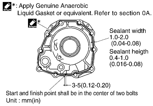 i) Apply recommended sealant (Genuine Anaerobic Liquid Gasket or equivalent. Refer to [Recommended Chemical Products and Sealants] Recommended Chemical Products and Sealants.) to rear extension assembly as shown.