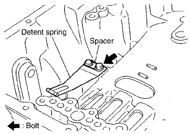 2) Install detent spring and spacer in transmission case and secure with the bolt.