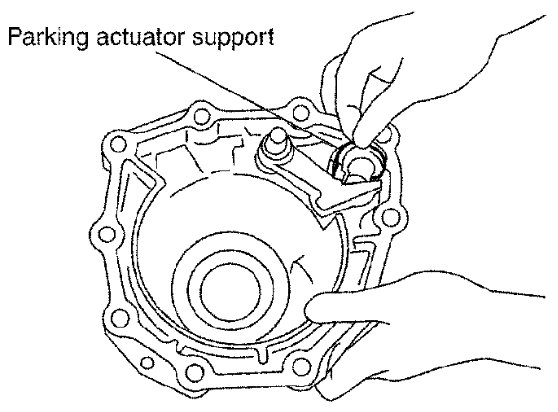 28) Install parking actuator support to rear extension (2WD models) or adapter case (4WD models).