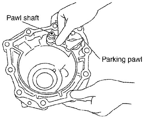 27) Install parking pawl (with return spring) and pawl shaft to rear extension (2WD models) or adapter case (4WD models).