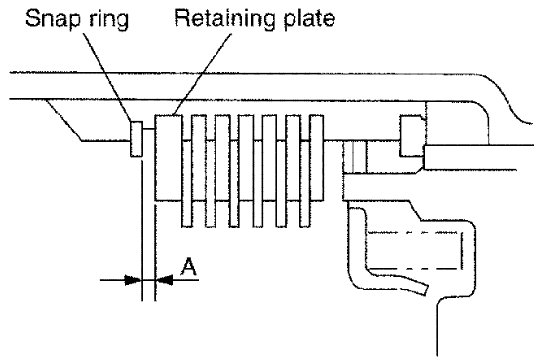 22) Measure clearance (A) between retaining plate and snap ring. If not within specified clearance, select proper retaining plate.