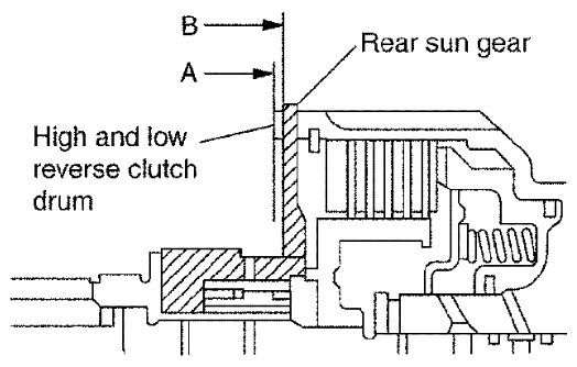 Make sure that portion "A" of high and low reverse clutch drum protrudes approximately 2 mm (0.08 in) beyond portion "B" of rear sun gear.
