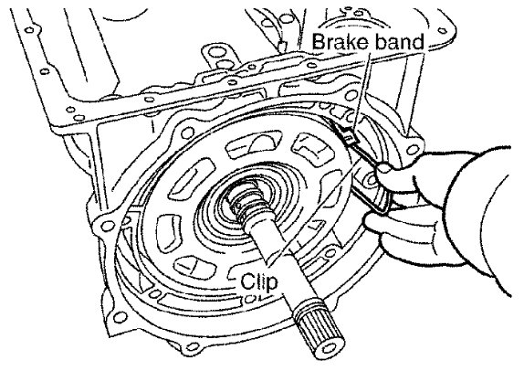 52) Adjust brake band tilting using a clip so that brake band contacts front sun gear drum evenly.