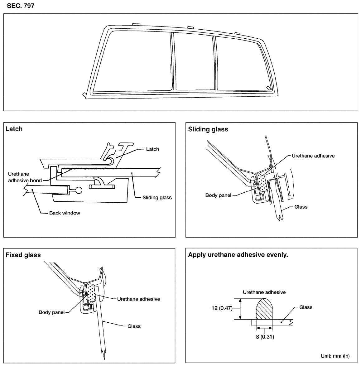 - Driving the vehicle before the urethane adhesive has completely cured may affect the performance of the rear window in case of an accident.