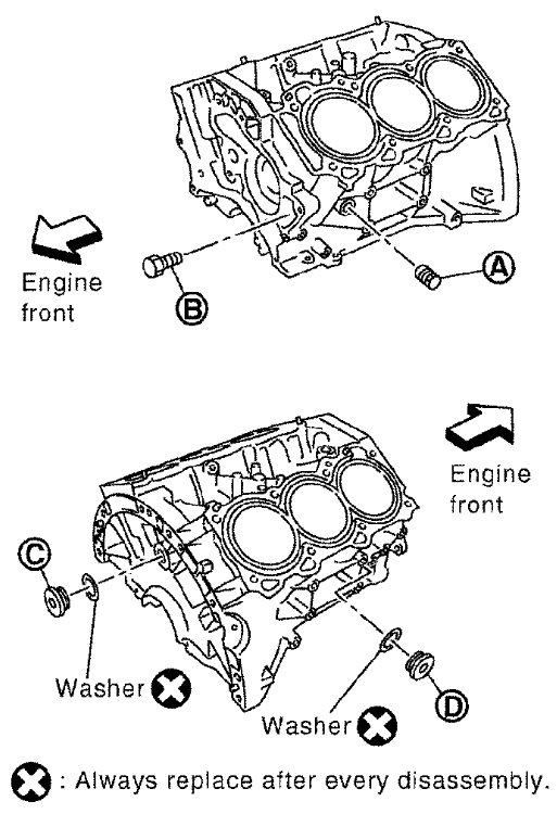 7) Drain engine coolant by removing the cylinder block drain plugs (A), (B), (C) and (D) from cylinder block as shown.
