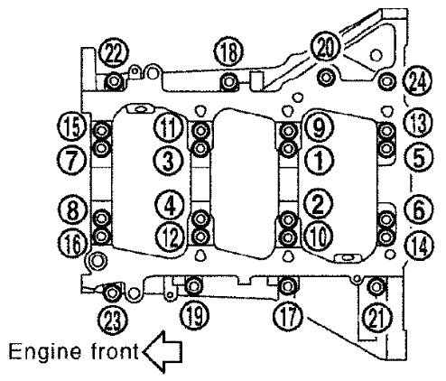 - Loosen lower cylinder block bolts in reverse order as shown in several different steps.