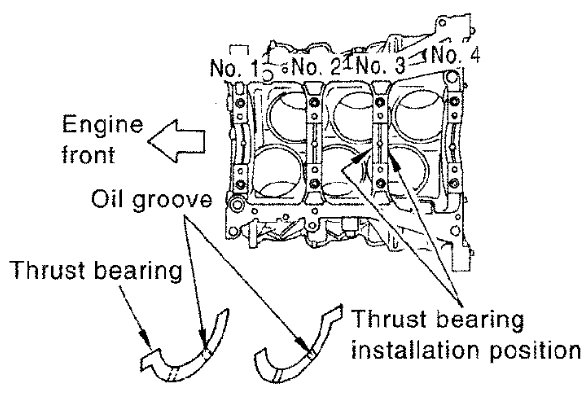 - Install thrust bearing with a projection on one end on cylinder block, Align projection with mating notch.