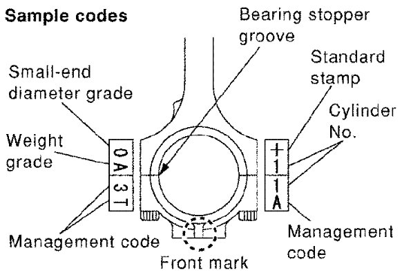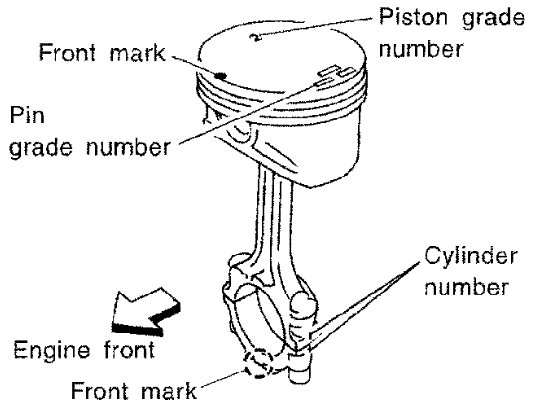- Assemble so that the front mark on the piston head and the cylinder number on connecting rod are positioned as shown.