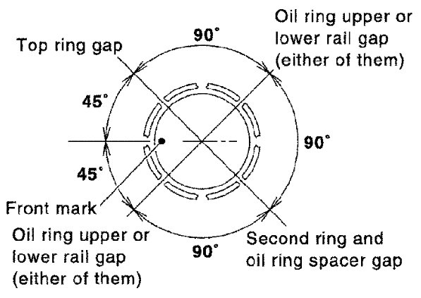 - Position each ring with the gap as shown referring to the piston front mark.