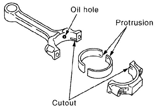 - When installing, align connecting rod bearing stopper protrusion with cutout of connecting rods and connecting rod bearing caps to install.