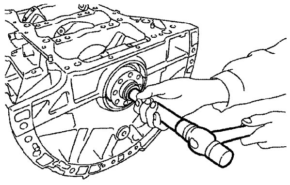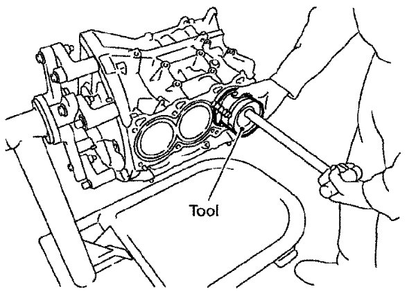 When replacing rear oil seal without removing lower cylinder block, use a suitable tool to pull the rear oil seal installed between crankshaft and cylinder block out.