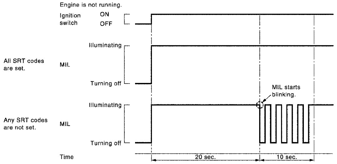 - ECM blinks MIL for about 10 seconds if all SRT codes are not set.