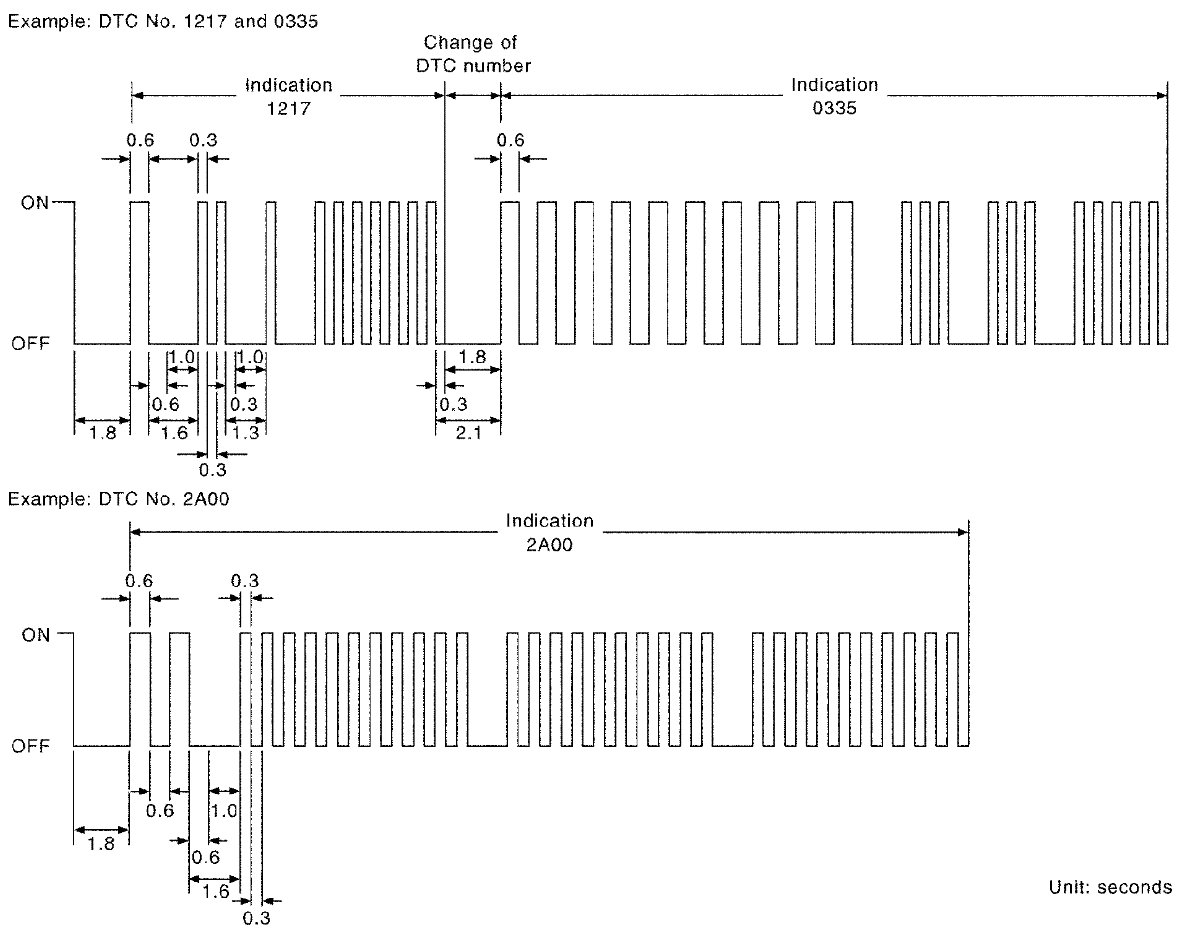 The DTC and 1st trip DTC are indicated by the number of blinks of the MIL as shown below.