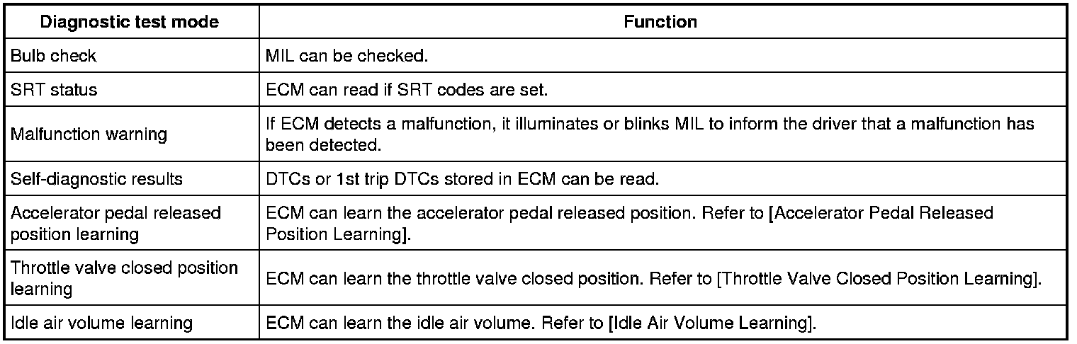 This function allows to read if ECM has completed the self-diagnoses of major emission control systems and components. For SRT, refer to [System Readiness Test (SRT) Code] System Readiness Test (SRT) Code.