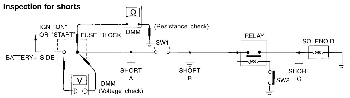 - Connect the other probe to the fuse block (power) side of SW1. Little or no resistance will indicate that portion of the circuit has good continuity. If there were an open in the circuit, the DMM would indicate an over limit or infinite resistance condition. (point A)