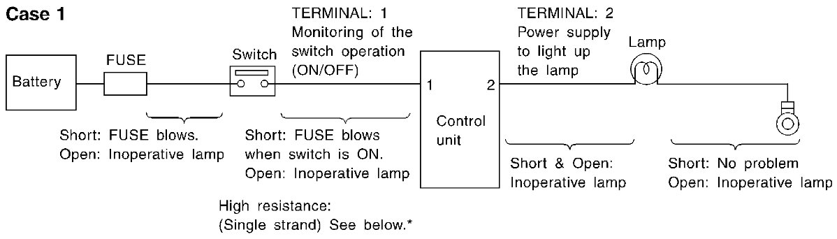 - *: If high resistance exists in the switch side circuit (caused by a single strand), terminal 1 does not detect battery voltage. Control unit does not detect the switch is ON even if the switch does not turn ON. Therefore, the control unit does not supply power to light up the lamp.