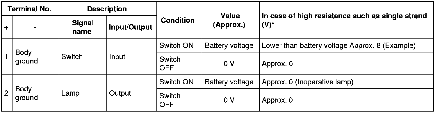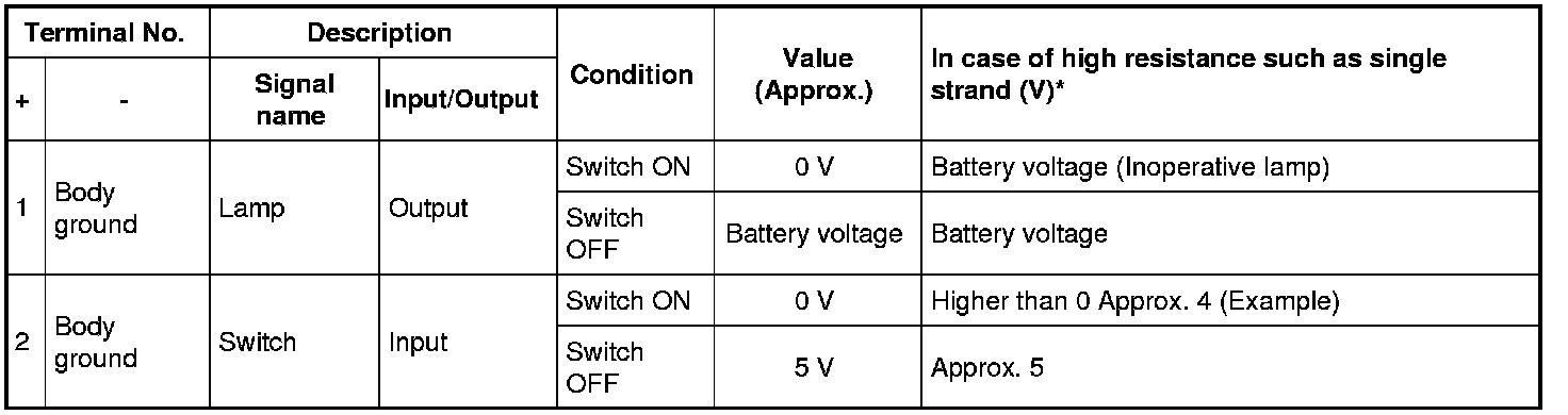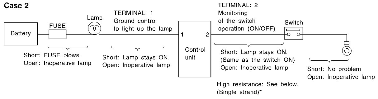 - *: If high resistance exists in the switch side circuit (caused by a single strand), terminal 2 does not detect approx. 0 V. Control unit does not detect the switch is ON even if the switch does not turn ON. Therefore, the control unit does not control ground to light up the lamp.