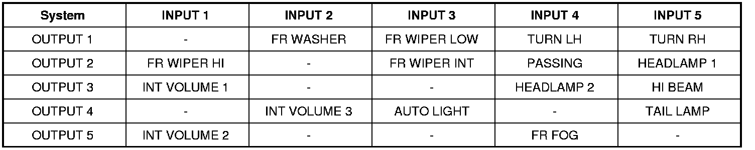 - The circuits between OUTPUT 1 and INPUT 5 and between OUTPUT 4 and INPUT 5 are formed when the TURN RH switch and TAIL LAMP switch are turned ON.