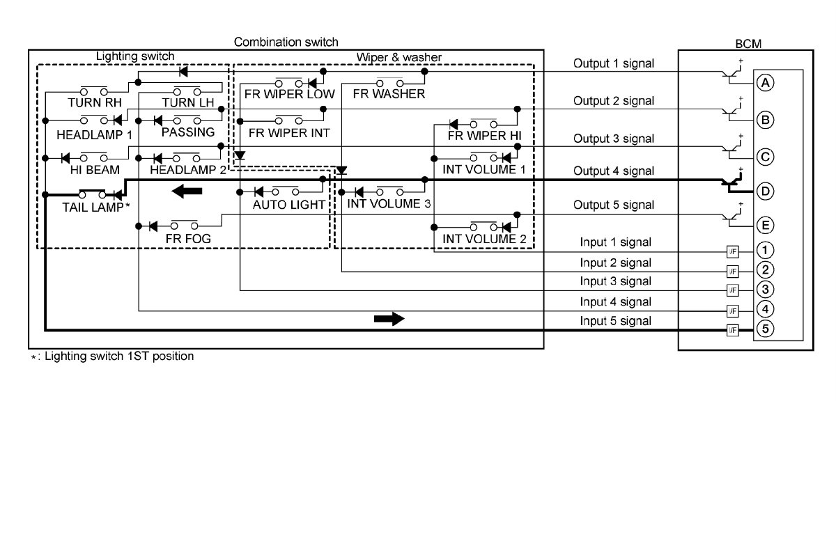- BCM detects the combination switch status signal "5AD" when the signals of OUTPUT 1 and OUTPUT 4 are input to INPUT 5.