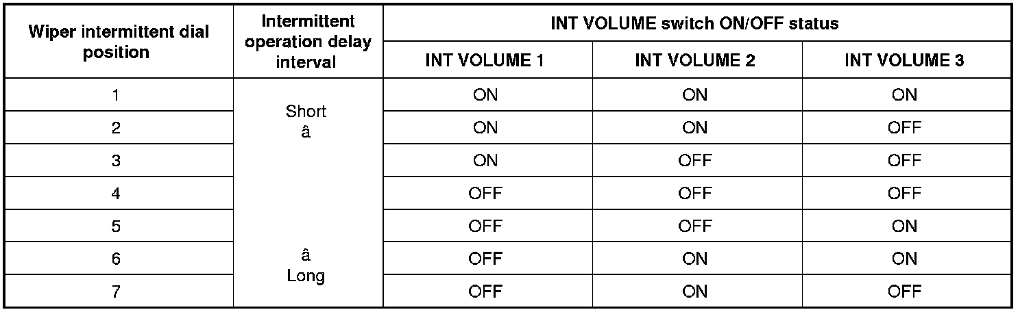 BCM judges the wiper intermittent dial 1 - 7 by the status of INT VOLUME 1, 2, and 3 switches.