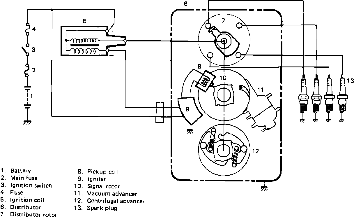 The basic components of the ignition system are ignition coil, distributor and spark plugs and those of the distributor are signal generator (signa rotor and pickup coil), igniter, rotor, cap, vacuum advancer and centrifugal advancer.