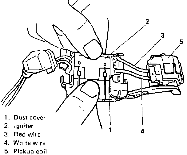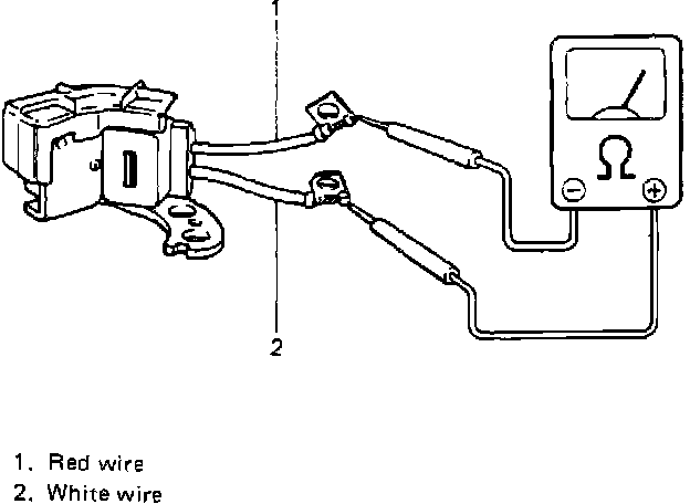 - Connect an ohmmeter to red and white wires, and measure pickup coil resistance. The pickup coil resistance is not within 130 - 190 ohms. If the resistance is not within specification, replace pickup coil.