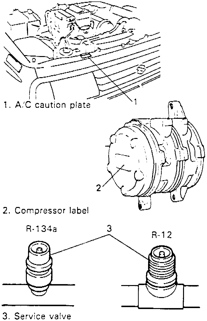 The air conditioning system may use either refrigerant CFI-12 (R-12) or refrigerant FC-134a (R-134a) depending on vehicle year and specifications. Refrigerant, compressor oil or components are not interchangeable between the two types of refrigerant systems.Fig. 1 Refrigerant System Identification:
