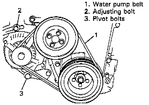 3. Tighten water pump belt adjusting bolt and pivot bolts.