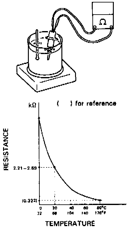 5. Immerse temperature sensing part of IAT sensor in water (or ice) and measure resistance between sensor terminals while heating water gradually. If measured resistance doesn't show such characteristic as shown in the image above, replace IAT sensor.