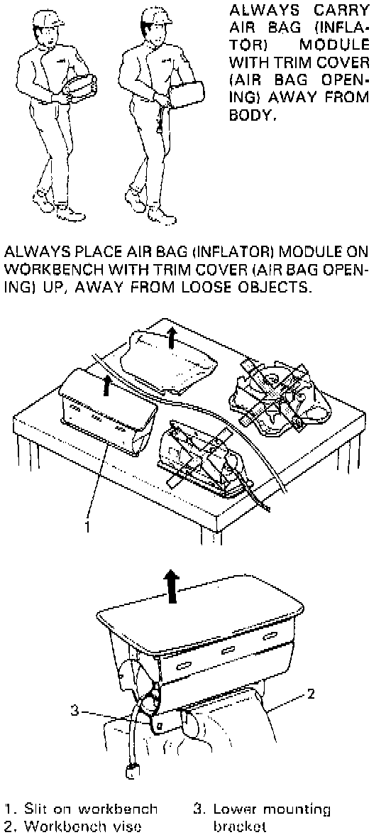 ^ When placing a live air bag (inflator) module on a bench or other surface, always face the bag up, away from the surface. As the live passenger air bag (inflator) module must be placed with its bag (trim cover) facing up, place it on the workbench with a slit or use the workbench vise to hold it securely at its lower mounting bracket.